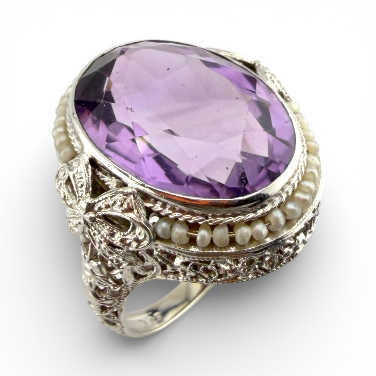 White 14K Vintage Amethyst & Seed Pearl Ring